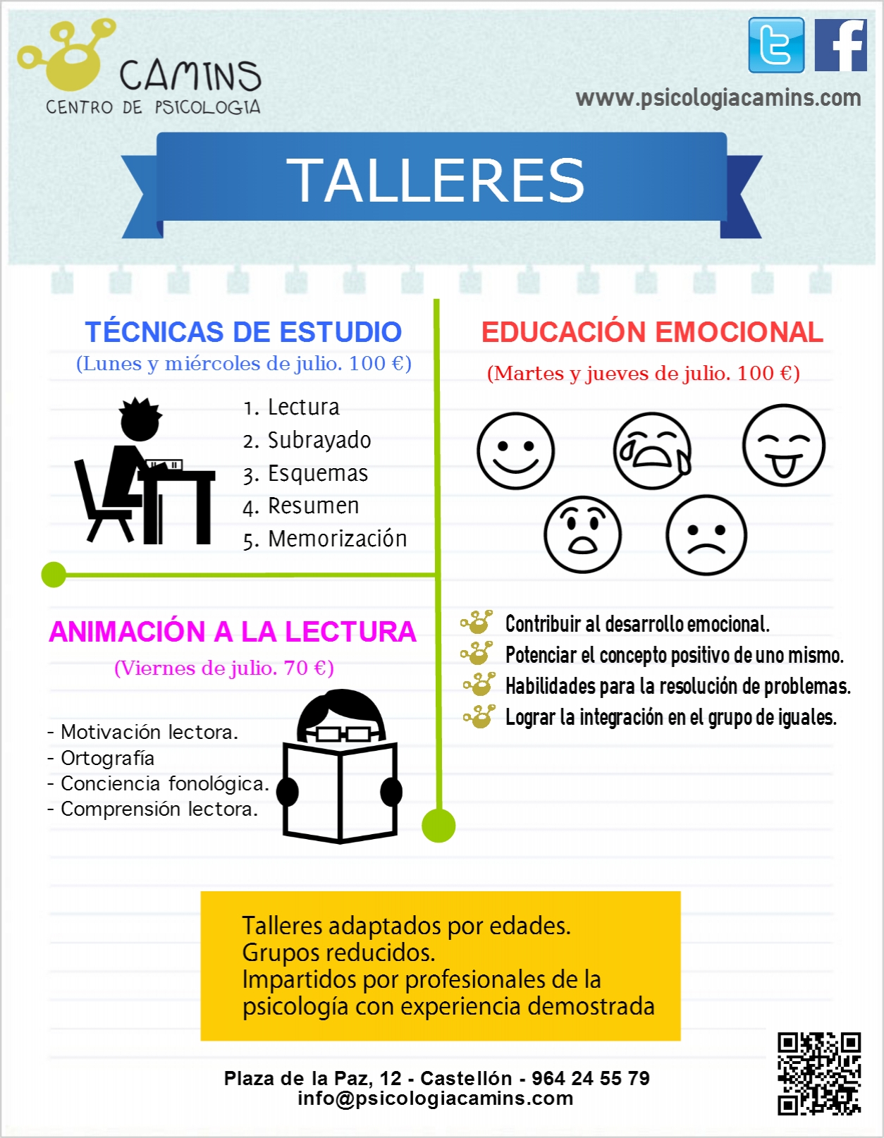 Todos los veranos en Camins realizamos una amplia variedad de Talleres destinados a niños y adolescentes. Estos talleres los podemos dividir en dos áreas, por un lado estás los que tienen como finalidad mejorar el rendimiento académico y prevenir el fracaso escolar, entre estos se encuentran: – Taller de Técnicas…