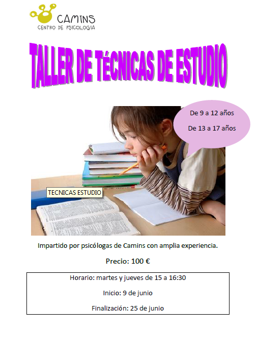 Durante el mes de junio Camins llevará a cabo un Taller sobre Técnicas y Hábitos de Estudio. En el taller se hablará de la importancia de la planificación y organización a la hora alcanzar buenos resultados académicos, así como  los pasos necesarios para conseguir un estudio eficaz: –          Lectura rápida…